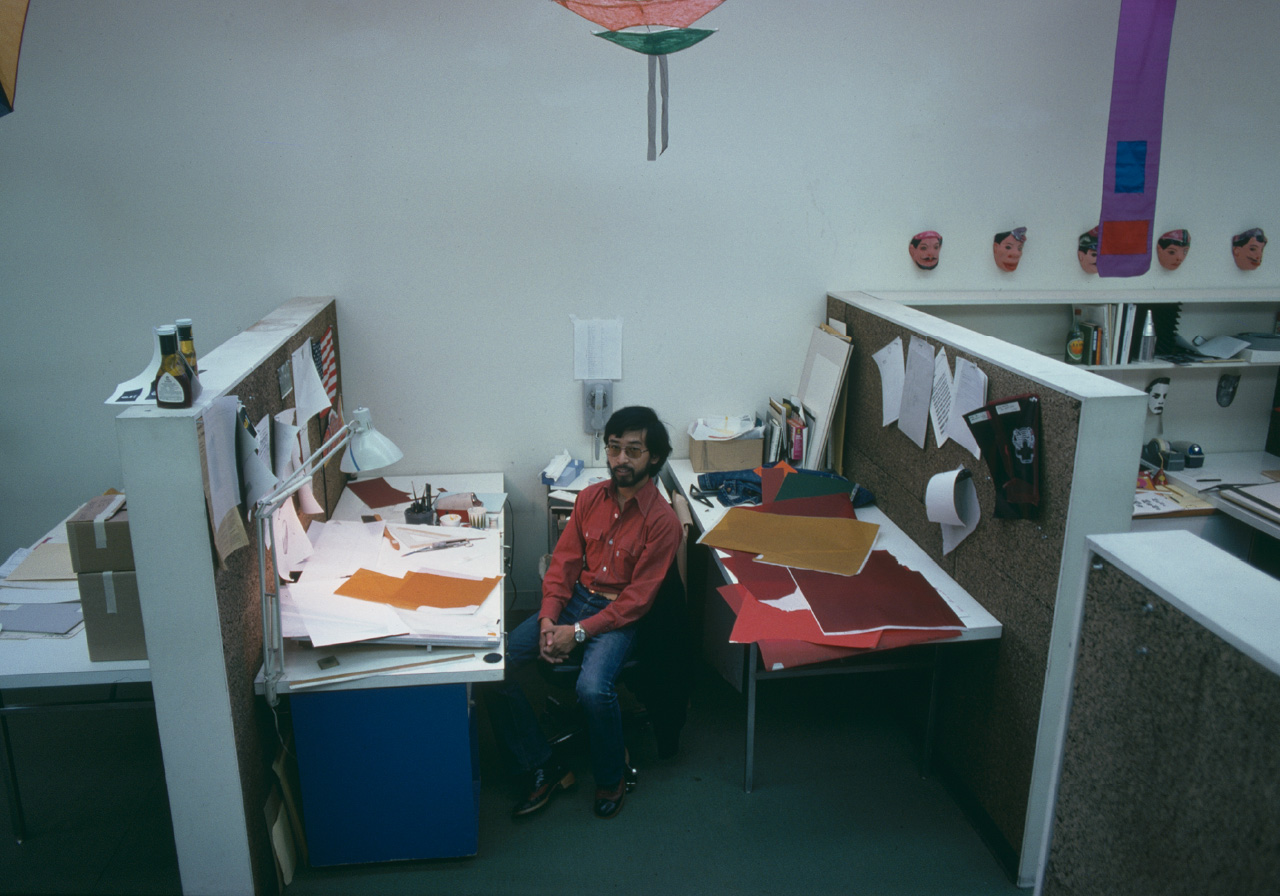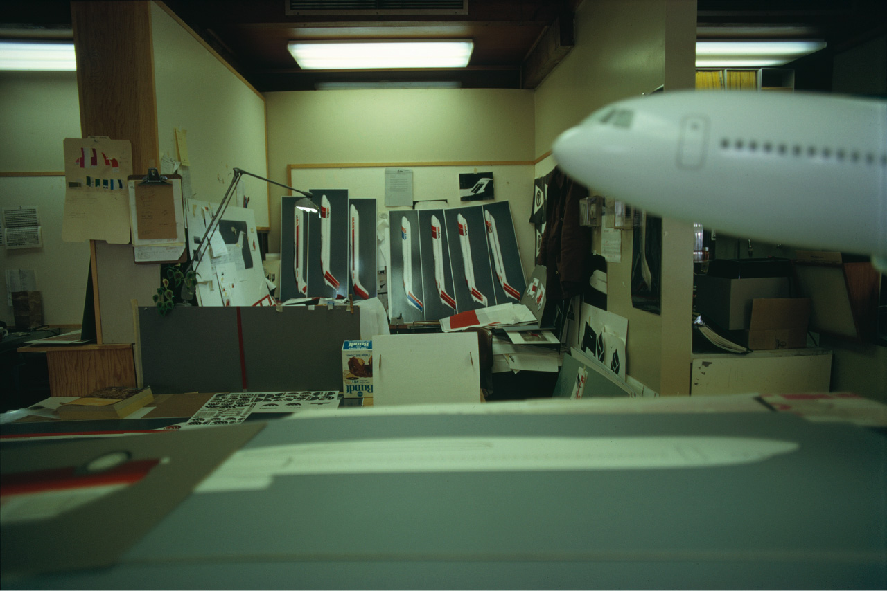 その後、ソール・バス・アンド・アソシエイツに移籍。コロラド州の航空会社「フロンティア航空」のプロジェクトでデザインが採用されました。プレゼンテーションはまずカタチを見せるため、PCもない時代です、モノクロの手書きのデザインを数百案ほど壁に貼ってクライアントに提示するのです。バス氏は短編アニメーショ「WHY MAN CREATES」でオスカーを得たほどの才人で、プレゼンテーションのストーリー作りは見事でした。(因みにオフィスに飾ってあるオスカー像を持たせてもらいましたが、結構重量感がありました)。