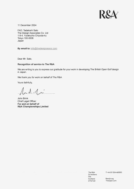 世界最古のゴルフトーナメント「全英オープンゴルフ」にはロゴがなく、電通からの依頼を受けてデザインすることになりました。当時全英オープンに関する資料は少なく、英国の紋章を参考にトロフィーをモチーフとしたデザインを開発しました。後にミズノ株式会社からの依頼で全英オープンのタータンチェックをデザインし、現在もスコットランド タータン ワールド レジスターに登録されています。